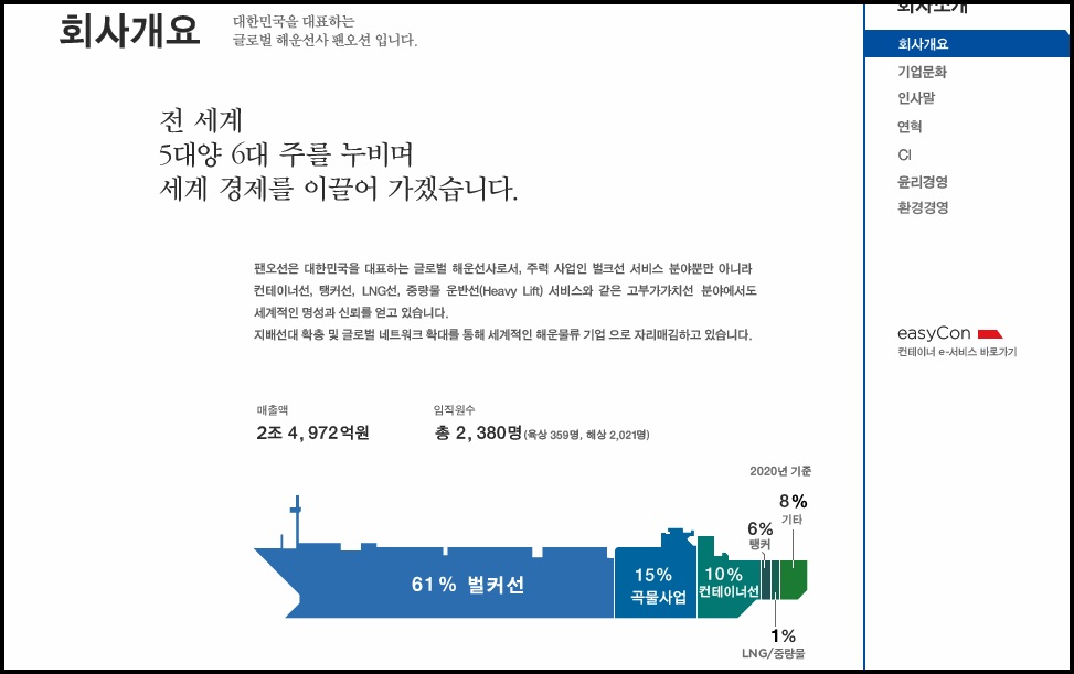 해운물류 기업 팬오션의 매출액은 홈페이지기준, 2조 4792억원이라고 하며 임직원수는 총 2,380명이라고 합니다.