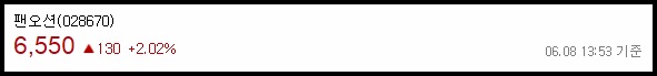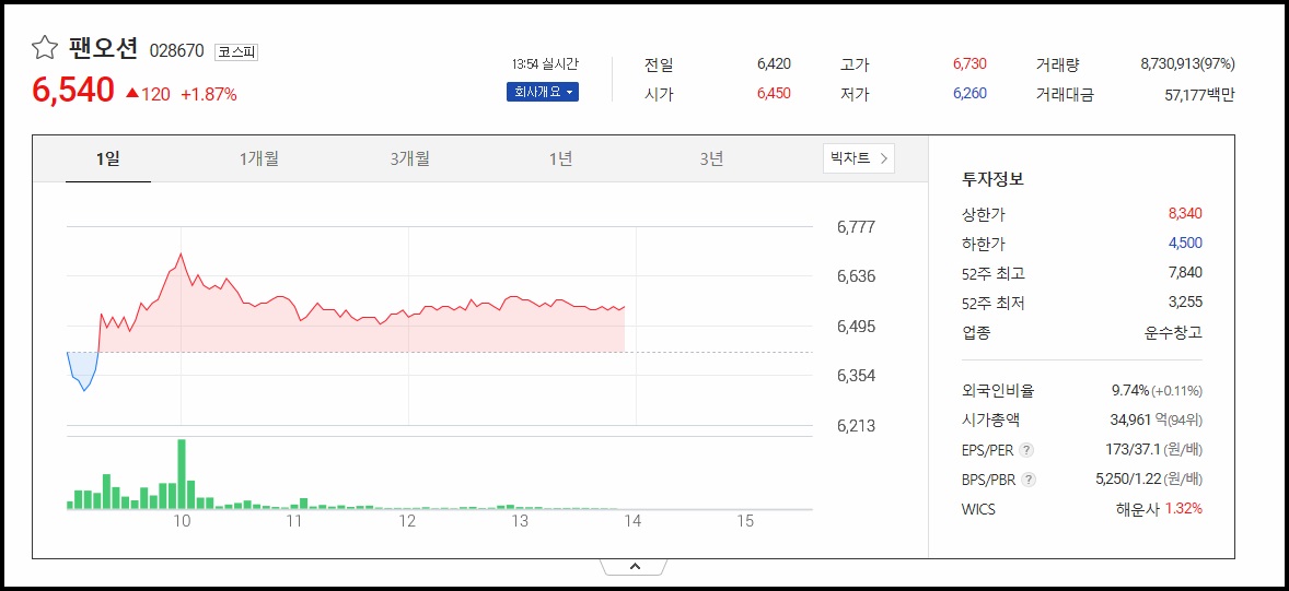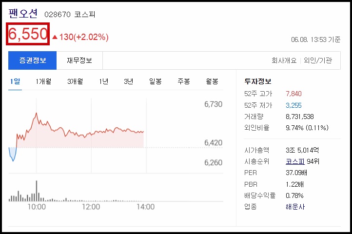 현재 팬오션의 주가는 6,540원입니다(2021년 6월 8일 장중기준)