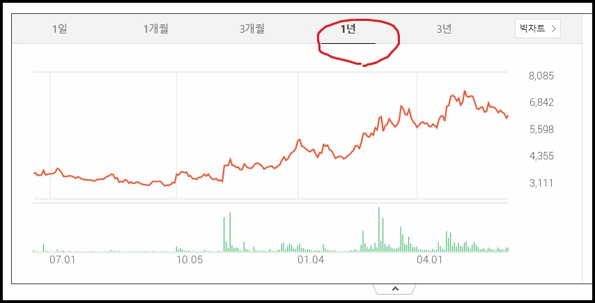 1년치 차트로 볼 때는 작년7월에 비해 확실하게 오른 가격입니다.