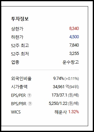 1주당 만원이 되지 않는 주식으로 1주당 4만5천원이 넘는 HMM등에 비하면 팬오션 주가를 보면 상대적으로 부담없이 접근할 수 있는 주식이기도 합니다.