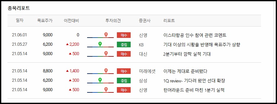 중립과 매수의견이 나온 종목리포트를 참고로 보시는 방법이 있습니다. 이스타항공 인수참여 관련코멘트와 목표주가 상향, 1분기 실적이후 턴어라운드에 대한 증권사 종목리포트가 나와있습니다.