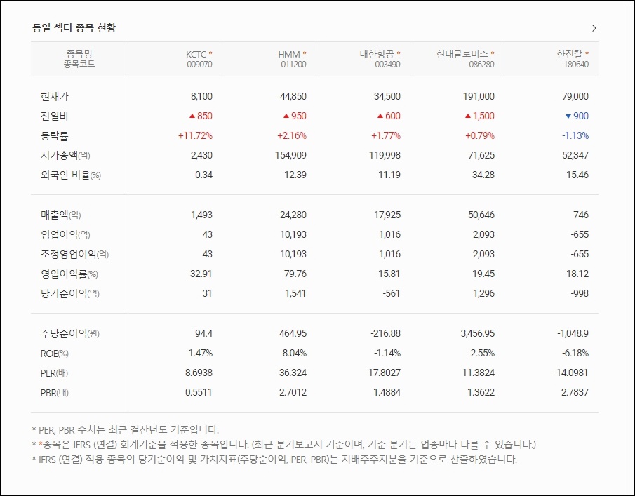 동일섹터 종목으로는 HMM과, 항공으로 물류를 운송하는 대한항공, 현대자동차 그룹의 종합 물류기업 현대글로비스, 대한항공의 인적분할로 설립이된 한진그룹의 지주회사 한진칼이 언급이 되었습니다.