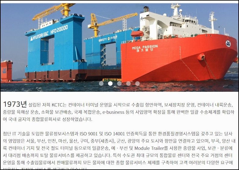 KCTC는 1973년 설립되었다고 하며, 앞서 설명드렸던 컨테이너 터미널 운영 사업뿐만 아니라, 수출업에서 항만하역, 보세장치장 운영등을 하고있으며 컨테이너 내륙운송이나 중량물 육해상 운동및 소화물 보관배송등의 사업을 하고있다고 합니다. 다양한 루트로 수송체계가 확립되어 있는 회사라고 볼 수 있을 것 같습니다.