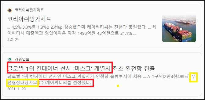 케이씨티시는 컨테이너 선사, 머스크 계열사 최초로 인천항에 진출한다고 합니다. 이들이 우선협상대상자로 주식회사 케이씨티씨를 선정했다는 뉴스가 보여집니다.