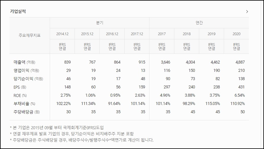 KCTC 기업실적입니다. KCTC의 매출액과 영업이익, 당기순이익, EPS, ROE, 부채비율과 주당배당금을 분기별, 연간으로 확인할 수 있습니다. (2017~2020년)