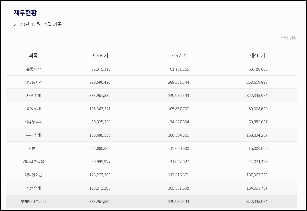 재무현황 역시 KCTC홈페이지에서 참고로 볼수있습니다. 2020년 12월 31일 기준이며 유동자산, 비유동자산, 자산총계부터 유동 비유동부채, 부채총계 등의 항목이 나와있습니다.