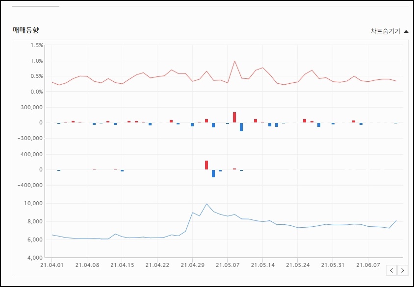 외국인 기관 매매동향입니다. 5월 0.31%에서 5월 25일 0.56%까지 갔다가 6월 11일 현재 지분율은 0.34%입니다.