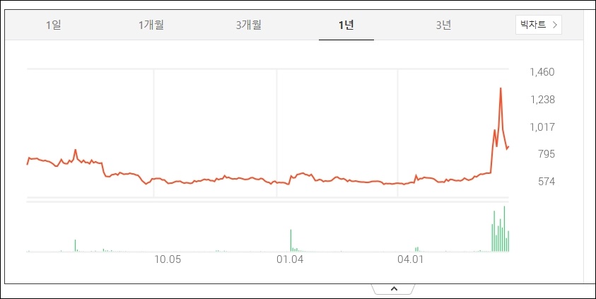 1년치 차트인데요 4~5월까지 대략적으로 박스권이었는데 1년만에 처음으로 급등을 했습니다.