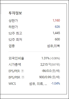 시가총액 순위로는 코스파 597위이며 시가총액은 2,215억원입니다. 외인비율이 1.31%정도 되므로 앞으로 여러가지를 주시해서 보신다면 주가전망에 도움이 될것이라 생각합니다.