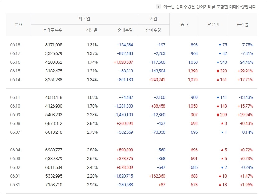 5월 31일 2.96%였는데 6.18일 지분율이 1.31%로 변화가 있었습니다.