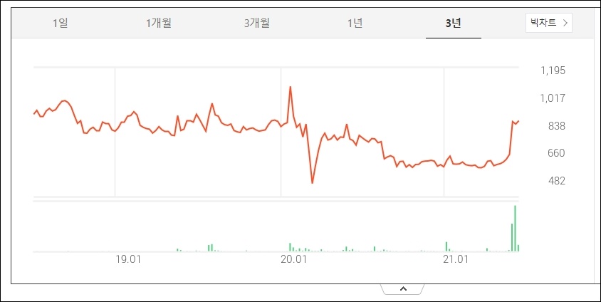 아무래도 1주당 가격이 크지않은 주식이라 3년치 가격으로 보면 주가의 흐름이 더 크게 보입니다