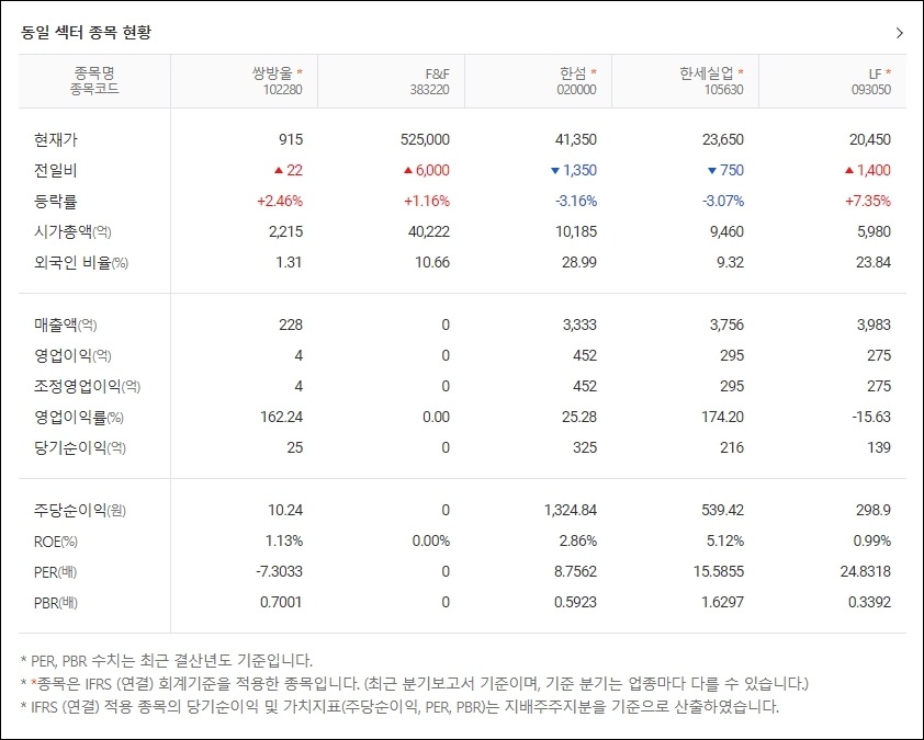F&F, 한섬, 한세실업, LF의 주가가 같이 나와있으니 확인해 보는것도 좋을것 같습니다.