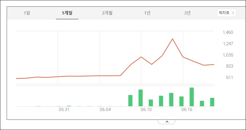 쌍방울의 1개월치 주가변동입니다. 6월 4일전까지는 박스권이었지만 6월10일ㅉ므 한차례급등, 그후 또한차례 급등하고 주가가 내려와 지금은 천원미만의 금액에 안착하였습니다.