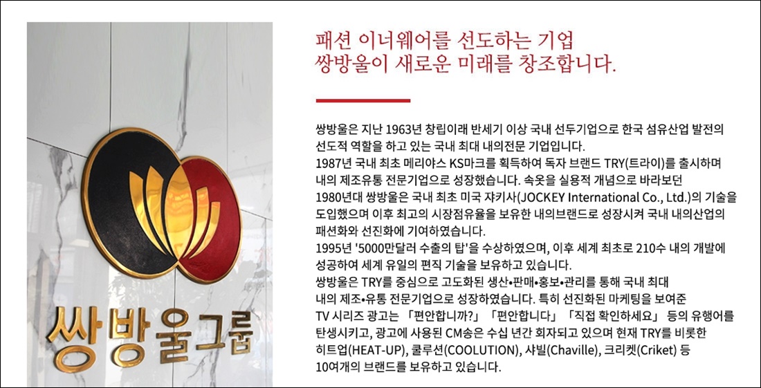 대략적으로는 이너웨어 회사(속옷회사)로 알려진만큼 내의를 생산하고 있으며 국내 최초 메리야스 KS마크를 획득한 사실이나, 미국 기술도입 내용, TRY중심 사업내용이 간단하게 홈페이지에 써있는것을 확인할수 있었으니 여러분들도 참조해 보시길 바랍니다.