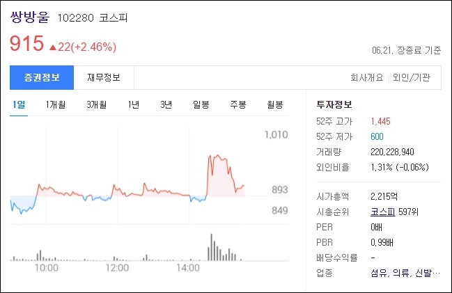 앞서 설명드렸듯, 쌍방울은 1주당 915원으로(6월 21일 장종료 기준)천원미만으로 투자할 수 있는 주식입니다. 소위 동전주라고도 불리우는데요, 요즘에는 코스피에서 동전주들이 많은 두각을 드러내고 있기에 쌍방울의 주가역시 분석해 보시는것도 나쁘지 않을듯 합니다.