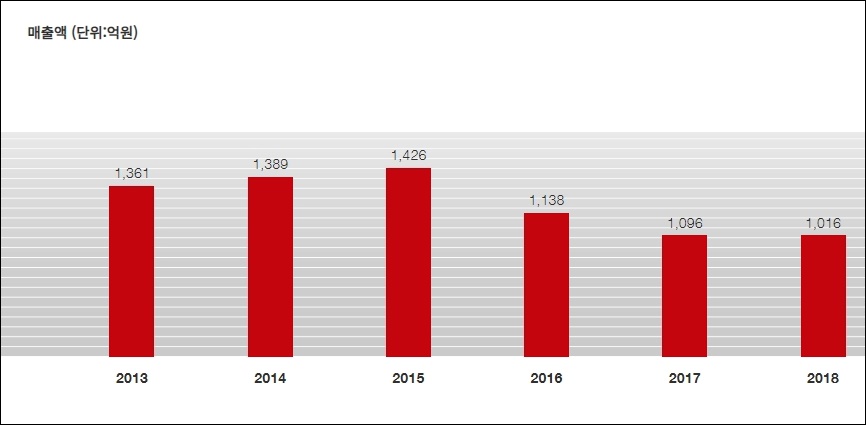 2013년 1,361억원에서 2014년 1,389억원이었고 2015년 1,426억원까지 매출을 경신했고 그이후 2017년 1,138억원, 2017년 1,096억원으로 감소하였고 2018년 쌍방울 매출액은 1,016 억원이었습니다.