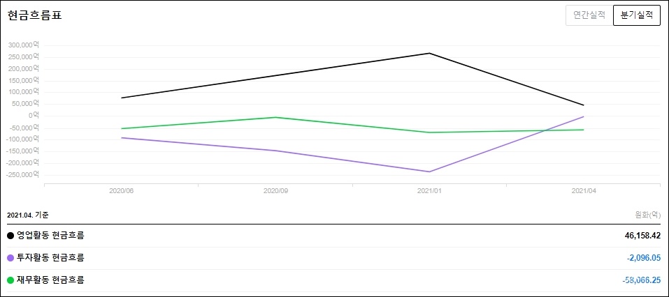 현금흐름표입니다. 영업활동의 현금흐름은 46,158.42억이며 투자활동과 재무활동 현금흐름에선 음의구간을 보여주고 있습니다. 각각 -2,096.05 억, -58,066.25 억입니다.