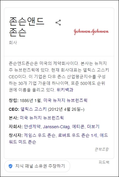 다우 존스 산업평균지수 구성기업에도 이름을 올리고 있으며 CEO는 앨릭스 고스키라고 합니다. 미국 뉴저지에 본사를 두고 있으며 자회사는 얀센제약을 더불어 에티콘등이 있습니다.