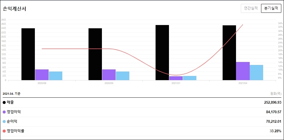 영업이익은 84,170.57억, 순이익은 70,212.01억이며 영업이익률은 33.28%였다고 합니다