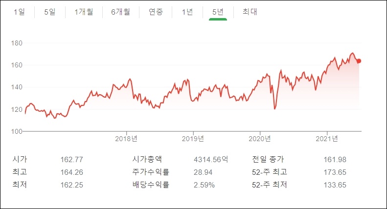 존슨앤드존슨의 5년치 차트입니다