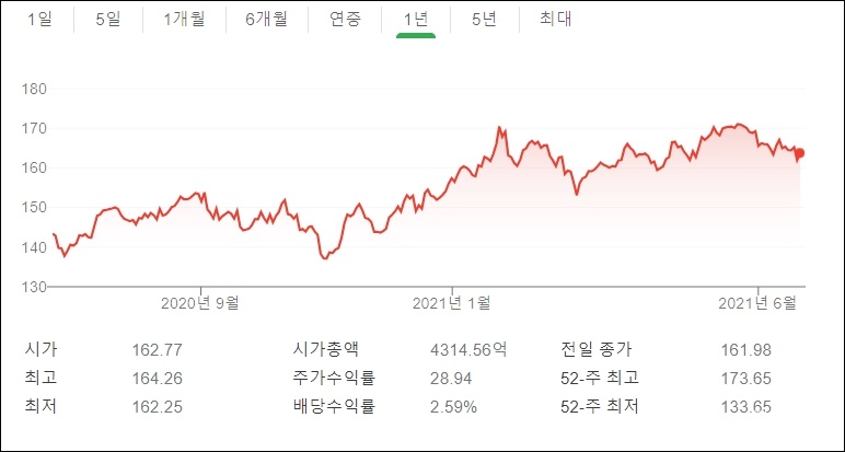 1개월 치 차트인데요 5월 24일 170.55USD로 시작했지만 현재 163.xxx달러이므로 조금 떨어진 가격이 되었다고 볼수 있겠습니다만 그 정도가 아주 극심할 정도로 주가하락을 보이진 않았습니다.
