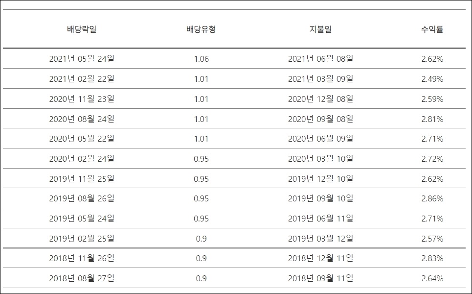 2018년부터 대략 2.5%정도의 배당 수익률을 보여주고 있고 가장 최근의 배당은 2021년 06월 08일이었던 것으로 확인이 되네요.