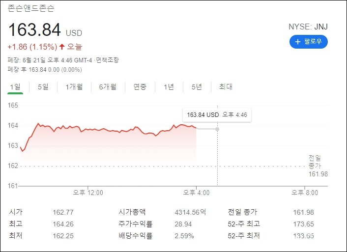현재 존슨앤드존슨 주가는 163.84 USD입니다
