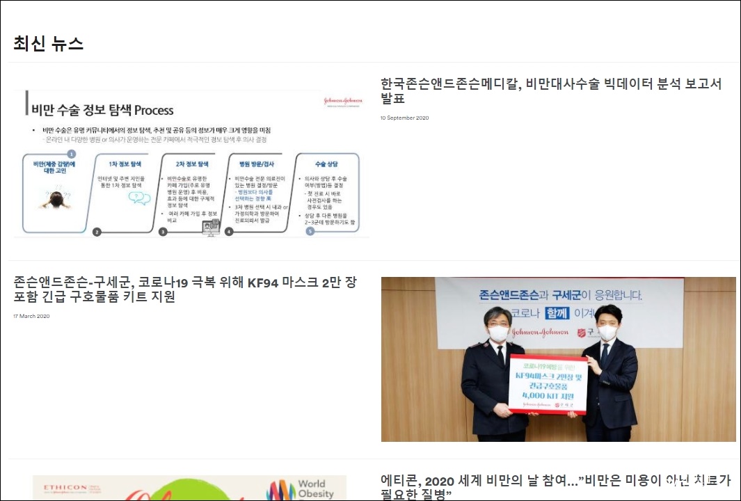 홈페이지에 에티콘과 한국존슨앤드존슨등이 최근 어떤 행보를 펼치고 있는지 간단히 알아볼수 있는 코너가 마련되어 있더라고요. 최근 코로나19 극복을 위해 KF94마스크와 긴급 구호물품 키트를 지원했다거나, 비만대사수술 빅데이터 분석 보고서등을 발표한 간단한 뉴스가 써있습니다. 따라서 한국존슨앤드존슨메디칼의 얀센백신 이외에도 여러가지 소식을 만나보고 주가를 전망해 보시는것도 좋을듯 합니다.