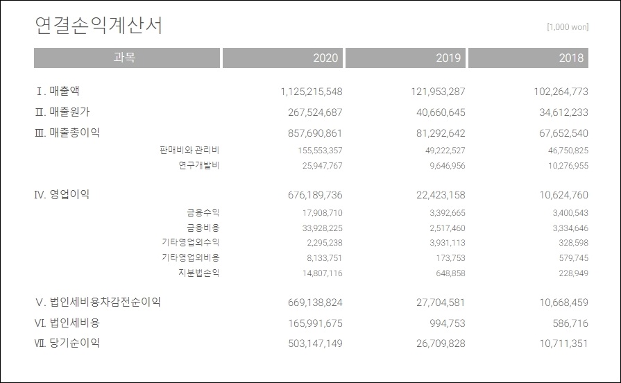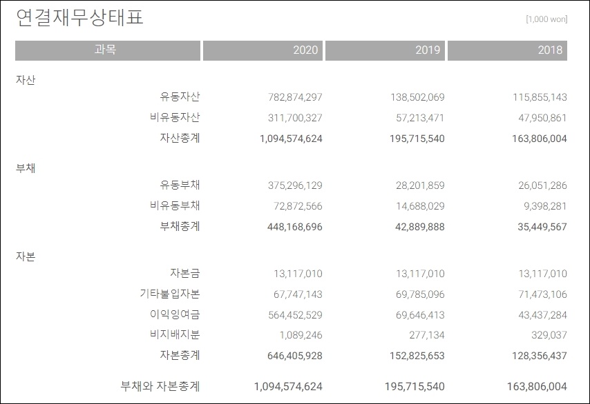 2018년부터 2020년 영업상태표입니다. 자산총계를 보시면 2020년 1,094,574,624(단위;1000 won)이며 부채총계는 448,168,696(단위;1000 won)입니다. 부채와 자본총계 또한 2018년부터 표에서 확인할 수 있습니다.