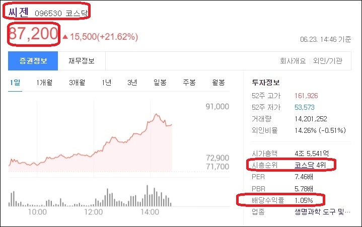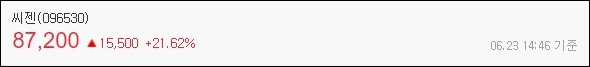 오늘 씨젠은 6월 23일 장중 가 기준으로 21.62% 상승하였으며 주가는 87,200원을 기록하였습니다.