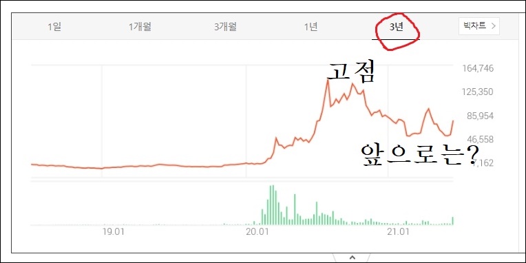 씨젠의 3개월치 주가 흐름입니다. 5월 초부터 계속 박스권이었고 하락이 있었습니다만 최근에 5만 원대에서 8만 원까지 호가를 했으므로 종목 리포트에서 제시한 대로 10만 원 이상의 주가를 언제 경신할지는 주목을 해봐야겠습니다.