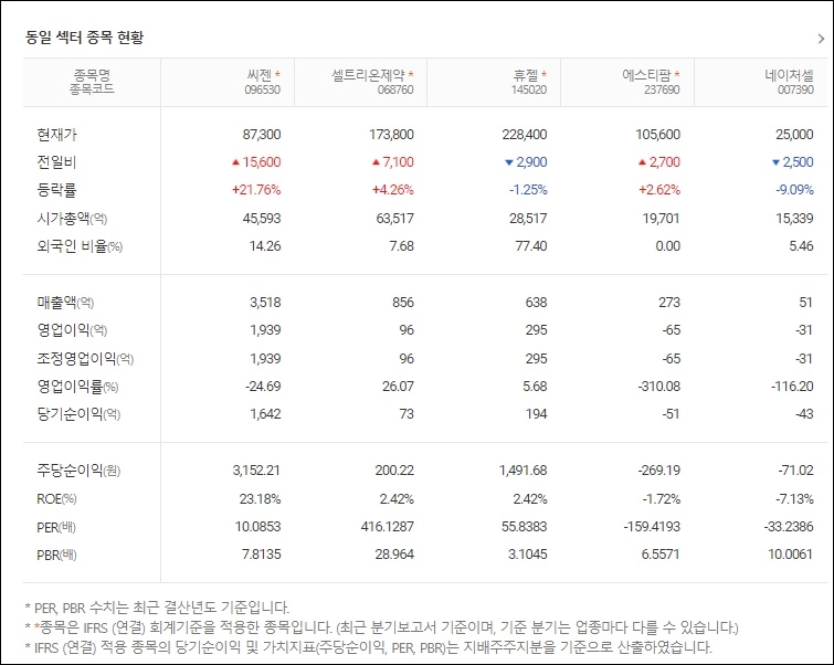 씨젠과 동일계열의 제약 의료 관련주로 셀트리온제약, 휴젤, 에스티팜, 네이처셀을 비교해 보시는 방법이 있습니다. 현재가와 매출액, 영업이익, 주당순이익, ROE, PER 등을 확인할 수 있습니다.