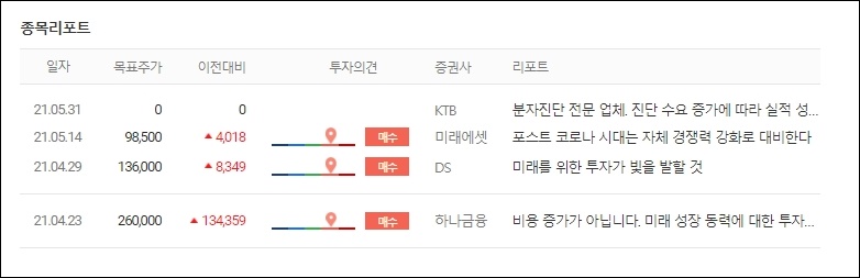 2021년 4월 23일 하나금융 증권사에서는 미래 성장 동력을 언급하였으며, 2021년 5월 14일 미래에셋은 포스트 코로나 시대의 자체 경쟁력 강화에 대한 주제로 종목 리포트를 제시하였습니다. 또한 21년 5월 31일 KTB 증권사에서는, 분자진단 전문 업체의 수요증가에 대한 내용으로 종목리포트를 제시하였고요.