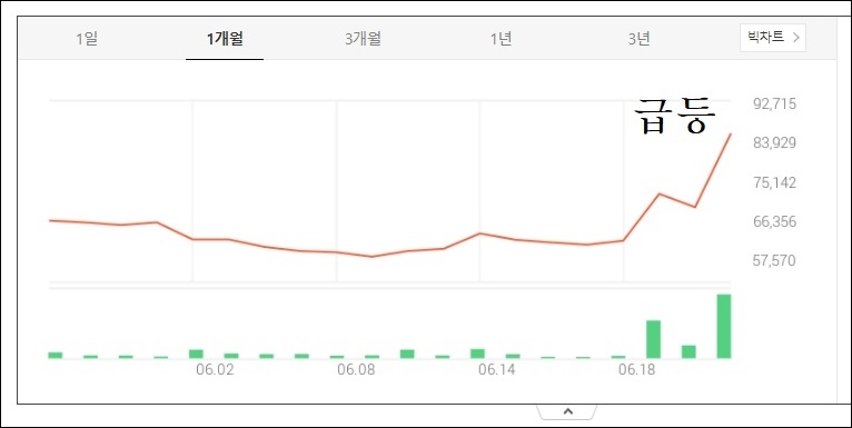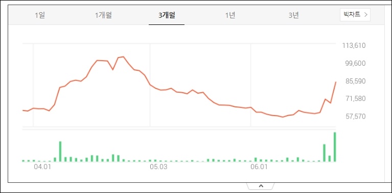 그리고 배당수익률 또한 1.05%이기 때문에, 배당금을 기대해볼 수 있는 주식입니다. 1주당 가격이 거의 9만 원에 육박하는 87,200원(6월 23일 장중가 기준)입니다.