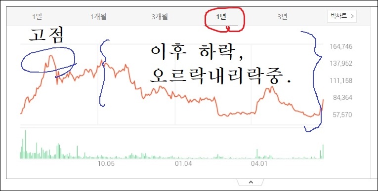씨젠 주가의 1년 치 차트입니다. 작년 10월 이전 고점을 찍고 그 이후 점차 하락세를 보여주었습니다. 불규칙적으로 오르락내리락했습니다만 최근에 8만 원 이상을 찍었고 앞으로 어떻게 될지는 회사 재정상황이나 관련 이슈와 맞물린 추이를 지켜봐야 할 것 같네요.