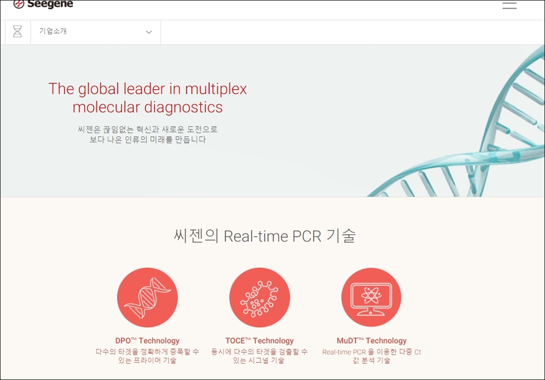 씨젠의 Real-time PCR 기술에 대해서도 홈페이지에 자세히 나와있습니다. 다수의 타깃을 정확하게 증폭할 수 있는 프라이머 기술 DPO Technology, 동시에 다수의 타겟을 검출할 수 있는 시그널 기술이라고 하는 TOCE Technology와,