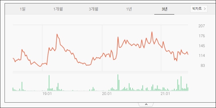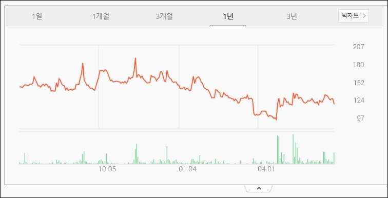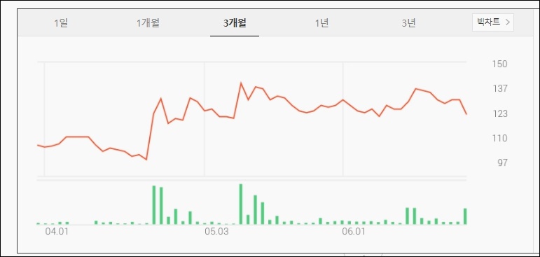 1주당 90원대인 적도 있었습니다만 3개월 차트를 보아도 150원의 고비는 넘지 못한 것으로 확인됩니다.