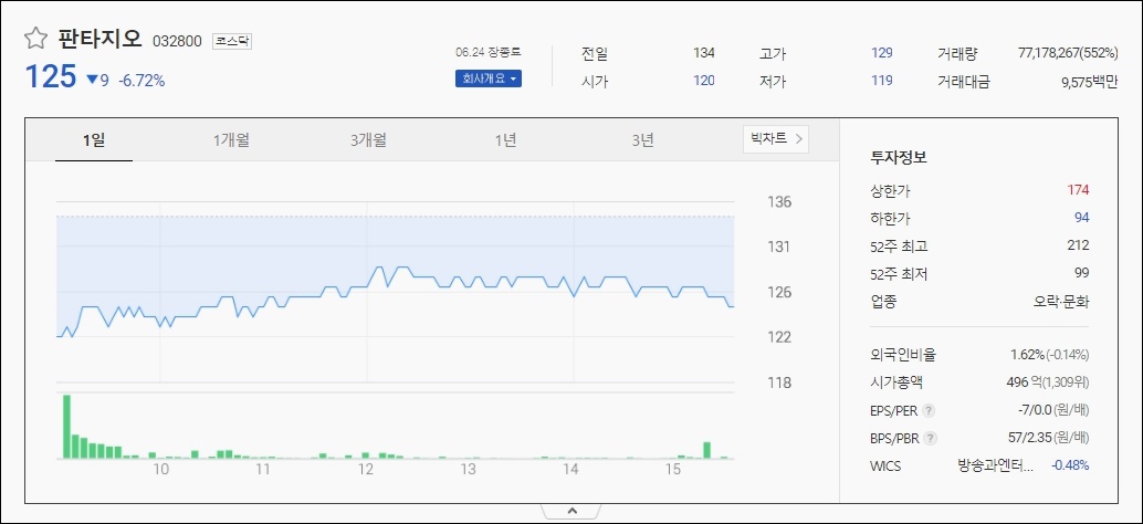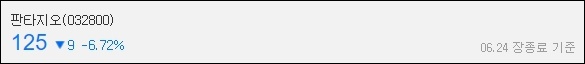 판타지오 1주당 주가는 125원이며 6월 24일 장 종료 기준으로 -6.72% 하락하여 125원에 마무리되었습니다.