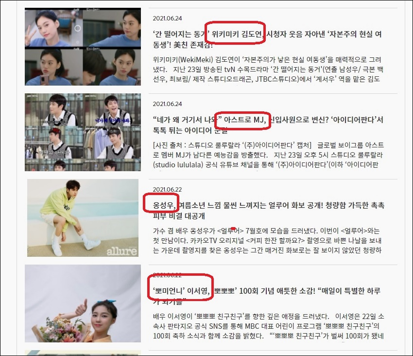 판타지오에 속한 위키미키 김도연 씨 이외에도 아스트로, 옹성우, 이서영 씨의 관련 뉴스를 찾아볼 수가 있습니다.