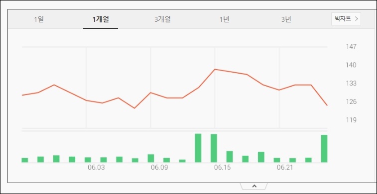 1주당 90원대인 적도 있었습니다만 3개월 차트를 보아도 150원의 고비는 넘지 못한 것으로 확인됩니다.