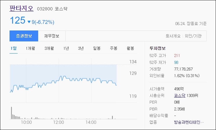 판타지오 1주당 주가는 125원이며 6월 24일 장 종료 기준으로 -6.72% 하락하여 125원에 마무리되었습니다.