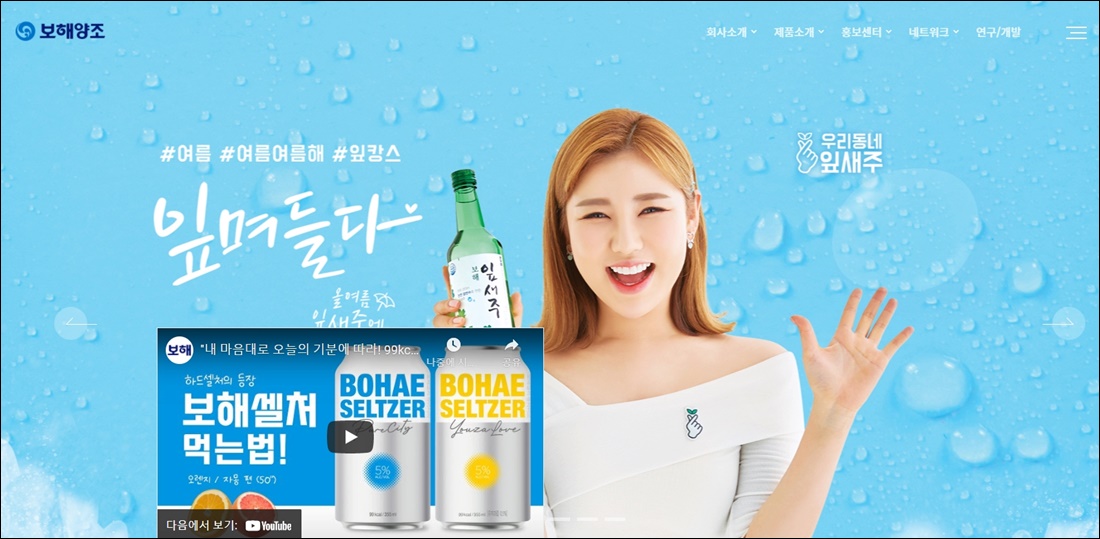 '잎며들다'라는 캐치프레이즈와 함께 상큼한 모델 송가인 씨의 모습을 보해양조 홈페이지에서 확인이 가능했습니다. 송가인 잎새주를 메인으로 내세우고 있지만 본 회사에서는, 보해셀처라든가 다른 주류 역시 살펴볼 수 있는데요, 이렇듯 꽤나 다양한 술을 생산하는 회사라는 것을 알고 투자하면 더 좋을 듯 합니다.