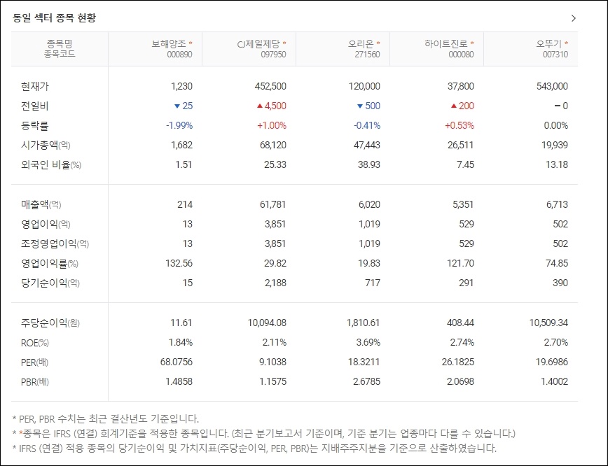 동일 섹터 종목 현황인데요 술 관련주/주류 관련주나 식품제조업의 주가가 나와있으니 참조하셔도 될 것 같습니다.