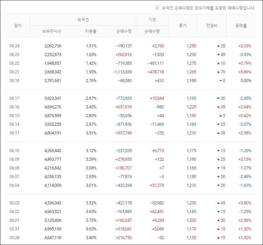 외국인 지분율은 6월 24일 1.51%이며, 지난 5월 28일과 313일에는 각각 3.40%, 3.63%를 보여주고 있습니다. 외국인 보유주식수는 살짝 감소한 것으로 보여집니다.