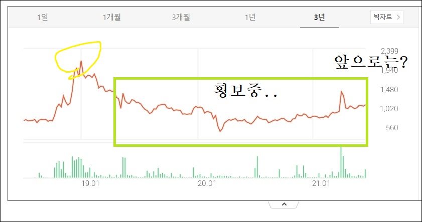 3년치 차트로 보면 2019년 고점을 찍고 주가가 하락하였으며, 현재는 하락한 주가를 복구하는 단계로 보여집니다. 이전의 고점은 회복하지 못하였지만 앞으로 호재가 있다면 지금의 상승랠리가 계속되지 않을까 하는데요.