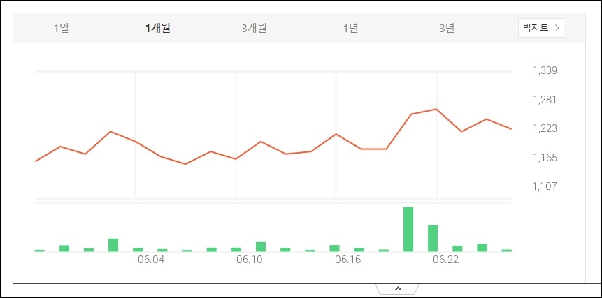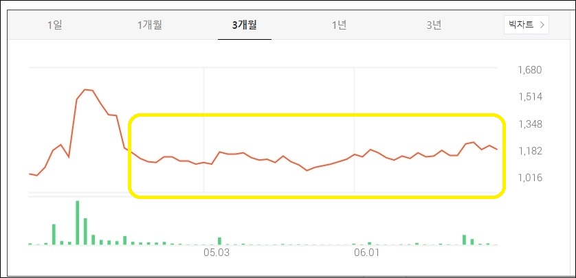 한때 1500원 정도의 가격을 호가하였던 주식이나, 이후 급락하여 5월부터 6월 내내 천 원대 초반의 가격으로 주가가 횡보하고 있습니다.