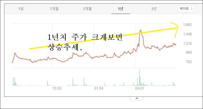 크게 본다면 상승추세를 보여주고 있으며, 천 원 미만의 동전주를 탈출하였고 한때 주가가 1500원 이상으로 갔으나 다시 원래대로의 상승추세 궤도에서 점차적인 오름세를 보여주고 있습니다.