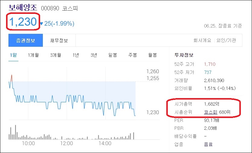 보해양조 주식의 현재가는 앞서 설명드렸듯, 한 주당 1000원대 초반 가격인 1,230원이고요. 시가총액은 1,682억, 시총 순위로는 코스피 680위를 차지하고 있다는 것을 알 수 있습니다.