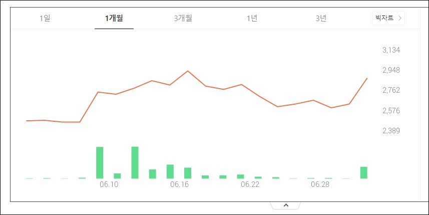 한창제지의 3개월 주가 흐름입니다. 5월 횡보하였으나 6월 초 이후 올라서 2000원대 중반을 넘어섰으며 다시 조정하여 2000원 초반의 주가로 하락하였으나 7월 1일 포장주 강세의 흐름과 맞물려 주가가 올랐습니다.