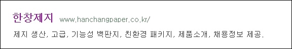 한창제지는 제지 생산 뿐만아니라 고급, 기능성 백판지를 제작하며 요즘 사업 트렌드인 친환경 사업까지 영위하는 회사입니다. 친환경 패키지 등 제품을 알아보시려면 한창제지 홈페이지 www.hanchangpaper.co.kr 로 들어가 보시길 바랍니다.